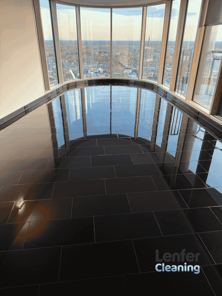 Een luxe woning, een hoogwaardige natuurstenen vloer – en een resultaat dat weer volledig past bij de uitstraling van dit appartement.