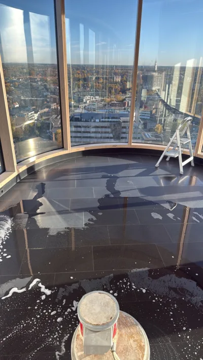 In een luxe appartement in de Vesteda Toren in Eindhoven hebben we een karaktervolle, maar duidelijk verouderde basaltvloer nieuw leven gegeven. Deze natuurstenen vloer – meer dan 20 jaar intensief gebruikt – was zichtbaar vuil geworden. Vlekvorming, strepen en een merkbare opbouw van vuil, vet en oude zeeplagen haalden de rijke uitstraling van het basalt naar beneden.